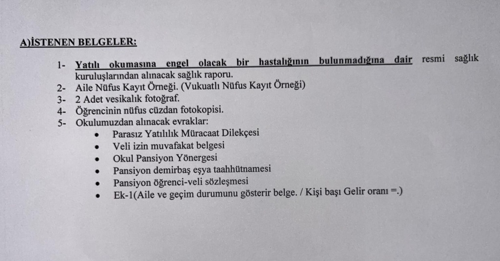 Okulumuz pansiyonunda kalacak öğrencilerin kayıt sırasında verecekleri evraklar (evraklar okuldan temiz edilecektir) ve pansiyona getirecekleri malzemeler listesi aşağıda sunulmuştur.